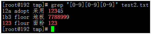 执行命令:grep "[0-9][0-9][0-9]" test2.txt