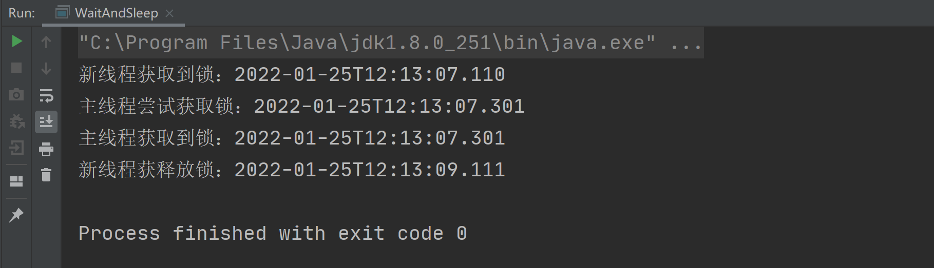 从上述结果可以看出,在调用了 sleep 之后,在主线程里尝试获取锁却没有成功,只有 sleep 执行完之后释放了锁,主线程才正常的得到了锁,这说明 sleep 在休眠时并不会释放锁。