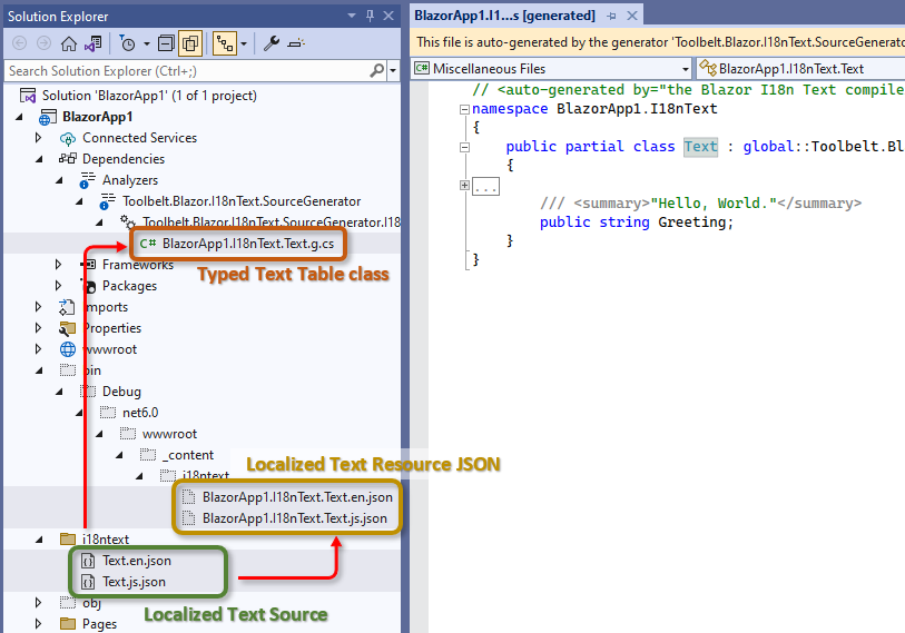 会使用source generator功能生成 "Typed Text Table class"文件."本地化文本资源 JSON"文件将在输出文件夹中生成.